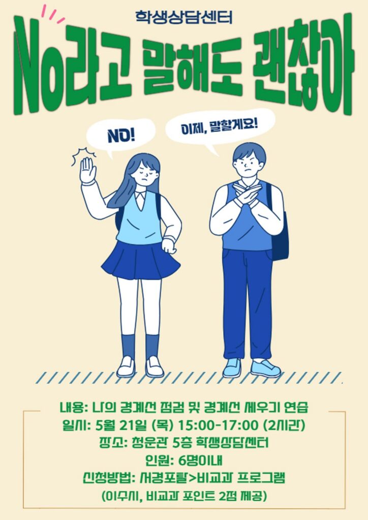역할극을 활용해 실제 상황에서 경계선을 설정하는 연습을 진행하며, 프로그램 이수 시 비교과 포인트 2포인트가 제공된다. 일상 속 관계에서 자신의 기준을 세우고 건강한 소통 방식을 익히는 데 도움이 되는 프로그램이다.