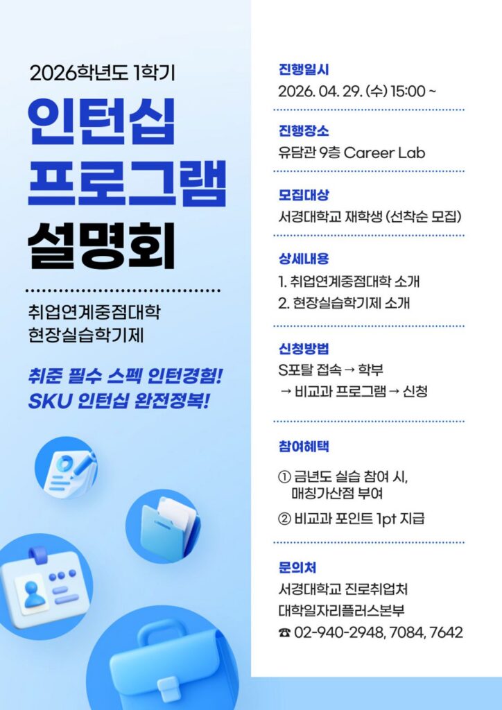 인턴십 프로그램 설명회가 유담관 9층 Career Lab에서 열린다. 서경대학교 재학생이라면 누구나 참여할 수 있으며, 선착순 70명을 모집한다. 신청기간은 2026년 4월 1일부터 4월 29일 14:59분까지로, 신청은 서경포탈에서 가능하다.