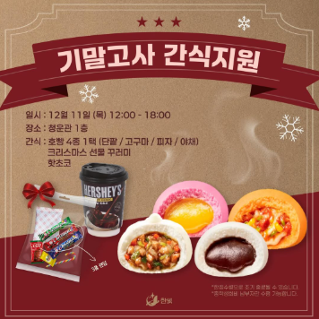 서경대학교 2025학년도 2학기 기말고사가 12월 17일(수)부터 23일(화)까지 5일간 실시된다. 서경대학교는 기말고사를 앞두고 시험 준비에 열심인 학생들을 위해 기말고사 시험기간 중 교내 유담관 9층에 위치한 자유열람실 중 제3~4 자유열람실을 24시간 개방한다. 개방 기간은 12월 15일(월)~18(목), 22(월)로 총 5일간이다. 12월 19일(금)부터 21일(일)까지 그리고 12월 23일(화) 이후부터는 24시간 개방이 아닌 정상 폐관으로 운영되며, 7~8층 정보자료실 개방시간은 기존과 동일하게 오전 9시부터 오후 9시까지 운영된다. 이와 함께, 총학생회와 각 단과대학, 학생 자치기구에서는 중간고사 기간 동안 학우들의 시험 준비를 응원하는 마음을 담아 다양한 간식 지원 이벤트를 진행한다. 먼저, 서경대학교 제52대 한숲 총학생회는 서경대학교 학우들의 따스한 겨울을 위해 ‘호빵(단팥 / 고구마 / 피자 / 야채) 4종 1택, 핫초코, 크리스마스 선물 꾸러미’를 마련한다. 12월 11일(목) 낮 12시 부터 오후 6시까지 청운관 앞에서 진행되며 총학생회비 납부자에 한해 가능하고, 준비한 간식이 모두 소진될 경우 조기 종료될 수 있다. 제35대 찬란 인문과학대는 학우들의 시험 준비를 북돋워 주기 위해, ‘통새우와퍼와 제로콜라’를 제공한다. 수령 기간은 12월 11일(목) 낮 11시 30분부터 오후 6시까지 청운관 810호 인문대 학생회실에서 학생회비 납부자에 한해 진행되며, 준비한 간식이 모두 소진될 경우 조기 종료 될 수 있다. 제34대 백야무적이공대에서는 추운 겨울, 마지막 기말고사를 준비하며 열심히 공부하고 있는 이공대 재학생들을 위해 ‘배달의민족 1만원 상품권’을 선착순 40명에게 제공한다. 행사는 12월 11일(목) 오후 6시 백야무적이공대 공식 인스타그램(@sku_34th_endlesslight)에 업로드될 게시물에 ‘학과 / 학번 / 이름 / 시험기간 멘트 한마디’에 댓글을 달면 된다. 단, 이공대 학생회비 납부자에 한해 진행된다. 제27대 통합청춘예술대에서는 예술대 학생들의 중간고사 응원 이벤트로 ‘피자 한 판 또는 분식세트’를 준비했다. 행사는 12월 16일(목) 낮 11시부터 오후 12시까지 청운관 1층에서 선착순으로 진행되며, 총 170개를 제공한다. 제41대 바름 총동아리연합회 또한 동아리원들의 학업을 응원하기 위해 간식 지원 이벤트를 진행한다. 12월 17일(수) 오전 11시 30분부터 청운관 1층 로비에서 ‘이삭시트 햄치즈 40개 또는 콘베이컨 에그마요 40개’를 제공하며, 소진 시까지 진행된다. 서경대 재학 중인 동아리원을 대상으로 하며, 동아리 단체방 확인 및 포탈 본인 인증 절차를 거쳐야 한다. 제1대 하나 미래융합대는 미융대 학생들을 위해 ‘신전떡볶이 떡볶이 순한맛 + 명랑핫도그 감자핫도그 + 립톤 아이스티’ 총 60개를 제공하며 12월 10일(수) 오전 11시 30분에 청운관 1층에서 재고 소진 시까지 진행한다. 간식은 수량이 한정되어 있으니, 받고 싶은 학생들은 예고된 시간보다 조금 일찍 방문해 미리 줄을 서는 것이 좋다. 또한 본인 확인을 위해 학생증이나 포털 화면 확인이 필요하니 미리 준비하길 바란다. 올 한 해의 마지막 시험을 앞두고 모두가 바쁜 시간을 보내고 있는 가운데, 이번 간식 이벤트가 그동안 열심히 달려온 자신을 잠시 돌아보고, 조금이나마 힘을 내는 계기가 되었으면 한다. <홍보실=임다현 학생기자>